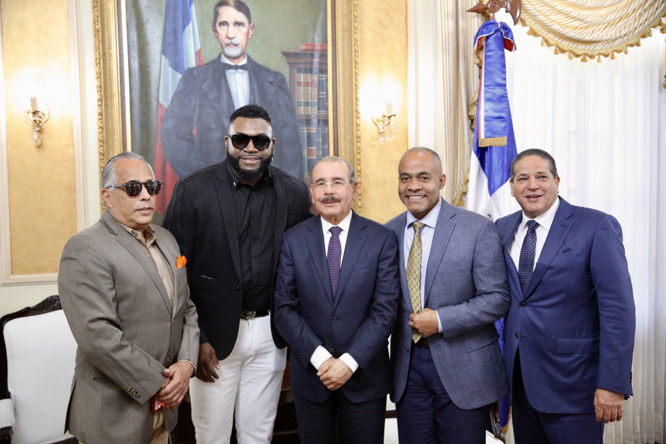 El presidente Danilo Medina, David Ortiz, Carlos Pared Pérez, Leo López, y acompañante presente en el encuentro.