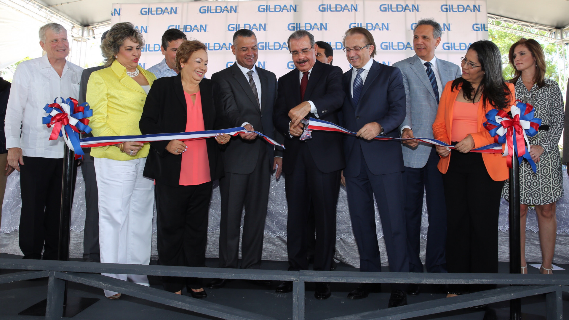 El presidente Danilo Medina, junto Javier Echeverría, vicepresidente y gerente de Gildan en el país; Benito Masi, vicepresidente ejecutivo de Manufactura Global, el embajador de Canadá en el país, Georges Boisse y la vicepresidenta de Responsabilidad Social y Comunicaciones de Gildan, Claudia Sandoval; los ministros Administrativo de la Presidencia, José Ramón Peralta y de Trabajo, Maritza Hernández, entre otros.