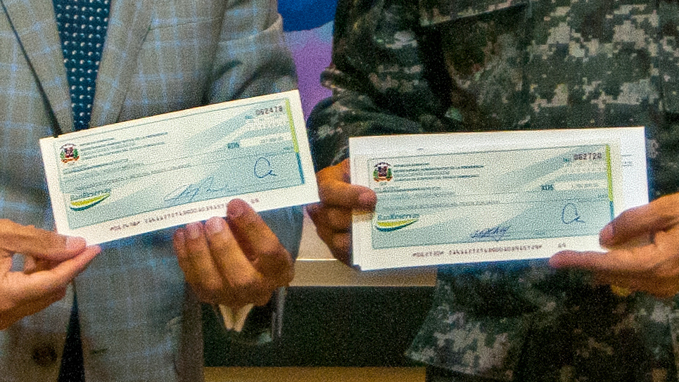 Cumpliendo los compromisos asumidos durante las Visitas Sorpresa 217 y 273, el director de la Policía Nacional, mayor general Ney Aldrin Bautista Almonte, recibió el desembolso de manos del viceministro de Producción y Desarrollo Comunitario del Ministerio Administrativo de la Presidencia, Juan Pumarol.
