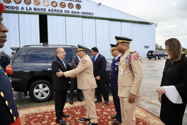El presidente Danilo Medina saluda al ministro de Defensa teniente general Rubén Paulino Sem, durante su salida hacia Guatemala, desde la Base Aérea de San Isidro.