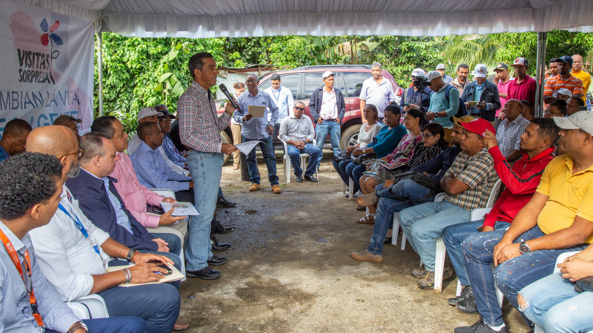 Reunión de seguimiento a la Visita Sorpresa 280, encabezada por Juan Pumarol, viceministro de Producción y Desarrollo Comunitario de la Presidencia, con productores y comunitarios de San Felipe Abajo, en Pimentel, provincia Duarte.