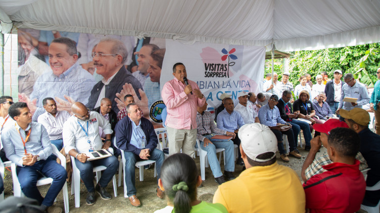 Reunión de seguimiento a la Visita Sorpresa 280, encabezada por Juan Pumarol, viceministro de Producción y Desarrollo Comunitario de la Presidencia, con productores y comunitarios de San Felipe Abajo, en Pimentel, provincia Duarte.