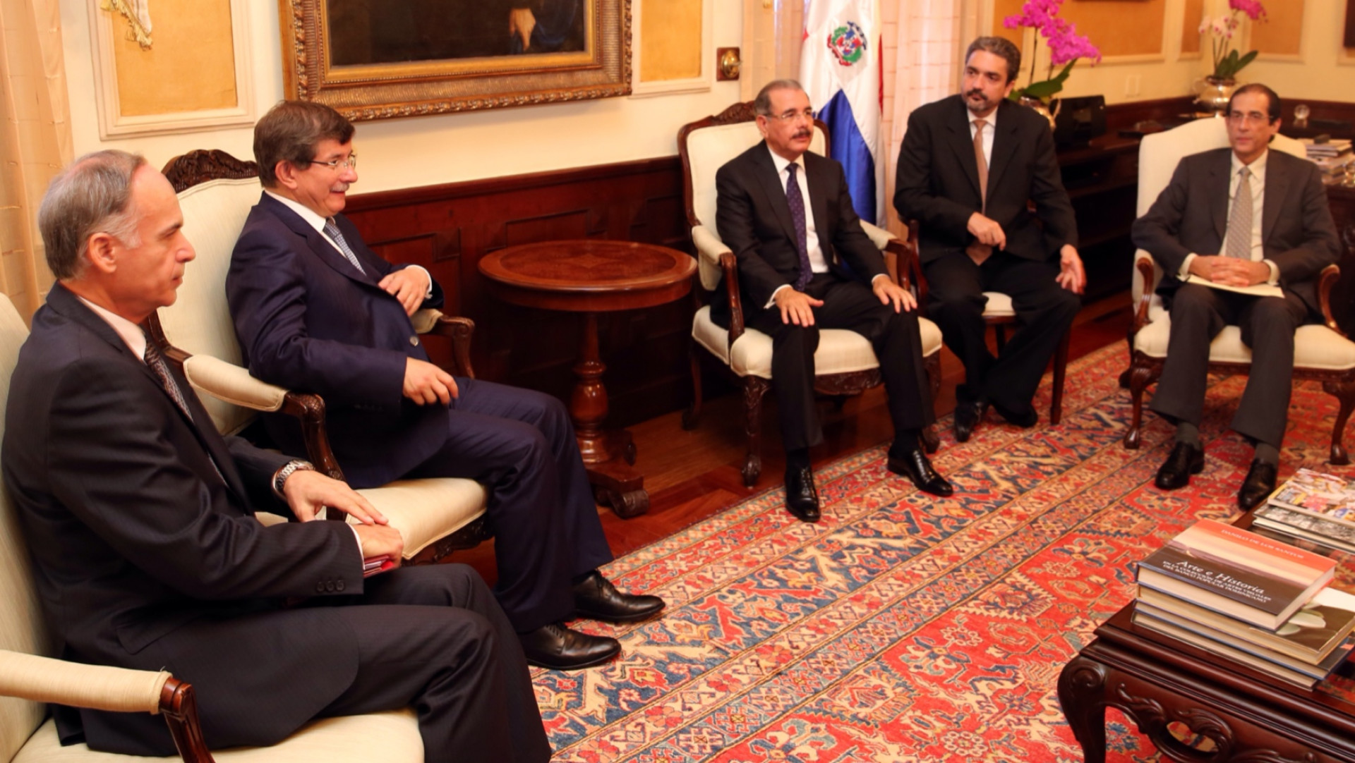 Participación del presidente de la República, Danilo Medina Sánchez, durante la visita de cortesía del ministro de Asuntos Exteriores de Turquía, Ahmet Davutoglu; el embajador de Turquía en nuestro país, Aydin Evirgen, y los viceministros de Relaciones Exteriores, José Manuel Trullols y César Dargam. Acompaña al mandatario el ministro Gustavo Montalvo,