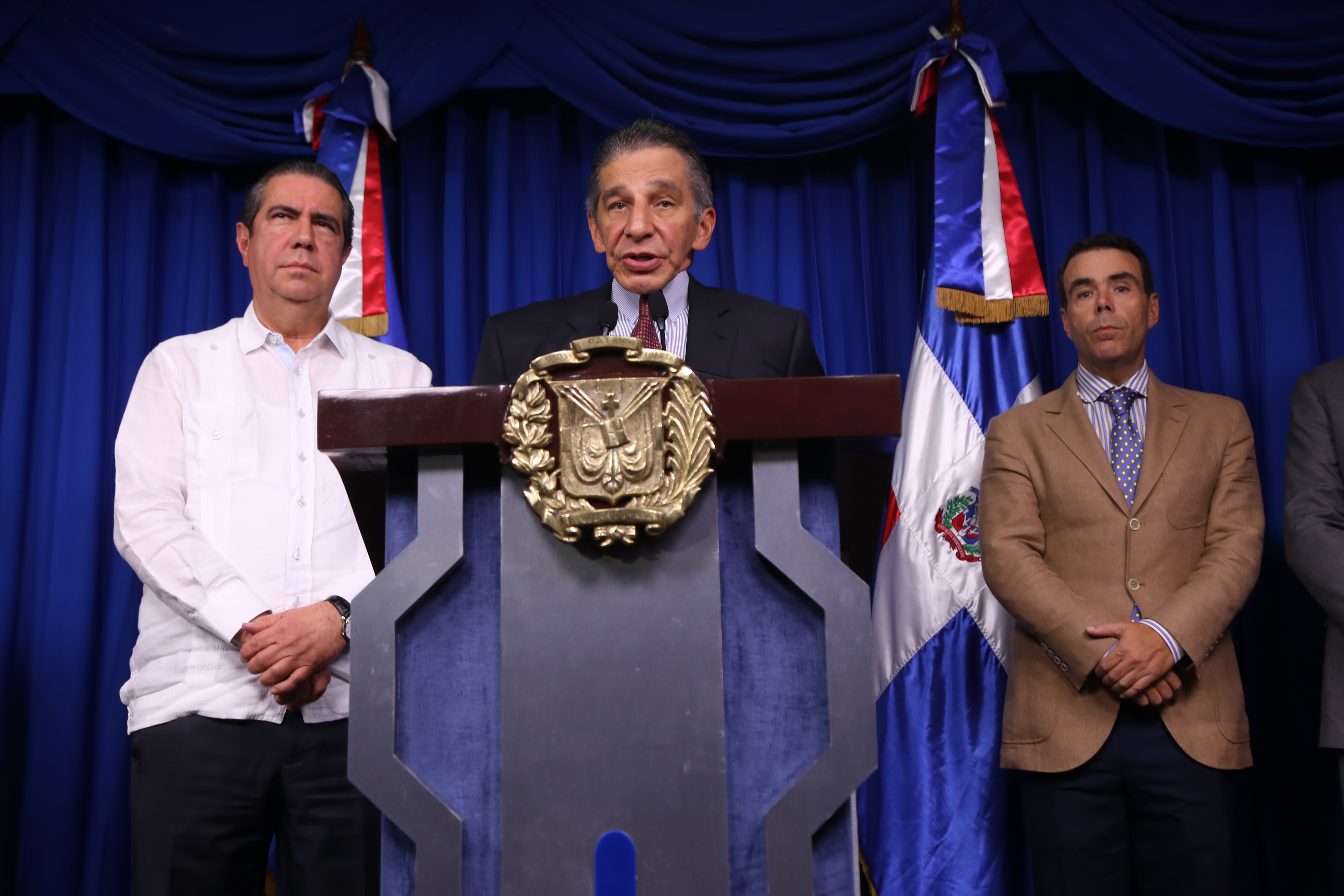 Ejecutivos del grupo empresarial Ágora, la cadena hotelera Hilton y del complejo Santiago Center, durante rueda de prensa en el Salón Orlando Martínez del Palacio Nacional.