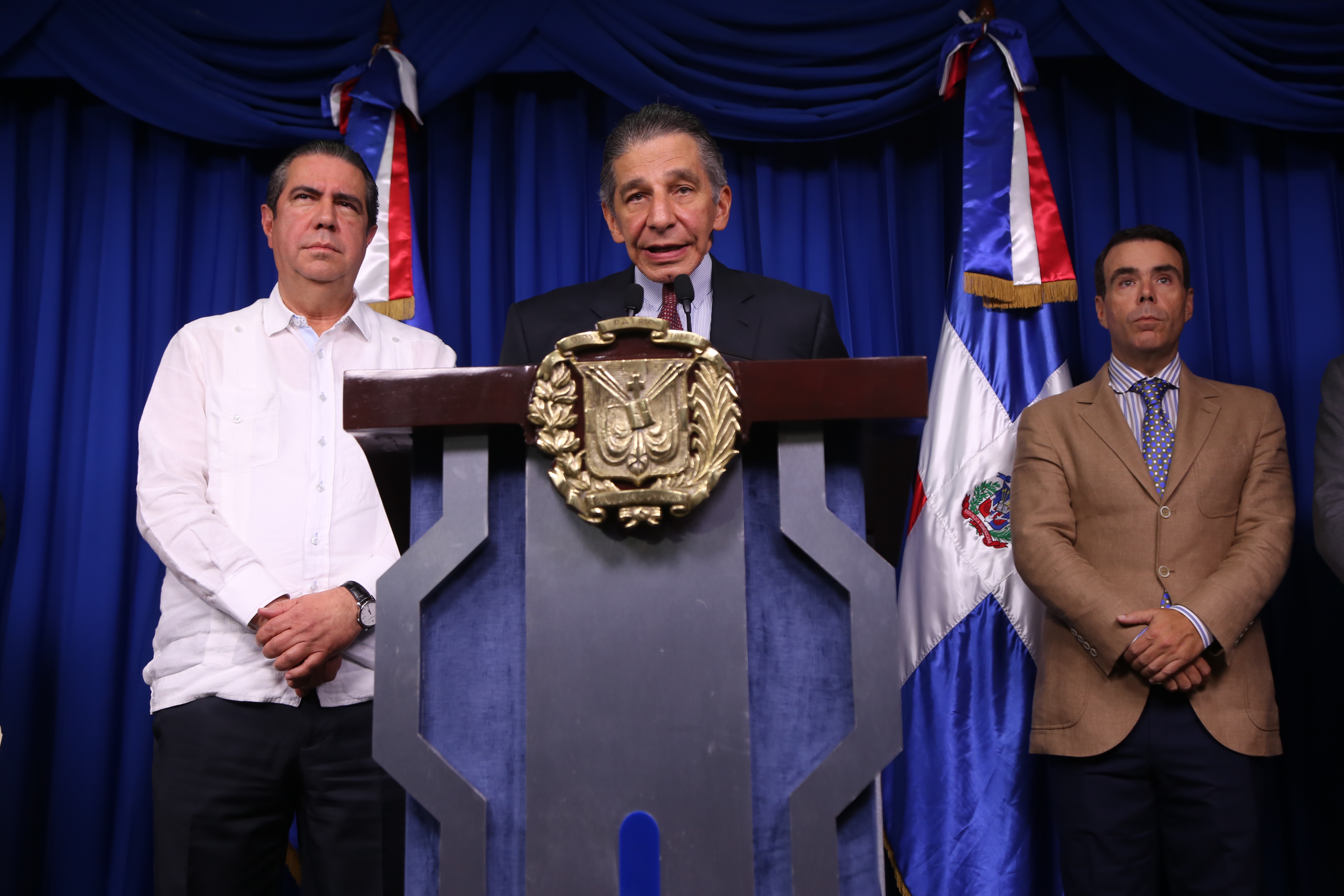 Ejecutivos del grupo empresarial Ágora, la cadena hotelera Hilton y del complejo Santiago Center, durante rueda de prensa en el Salón Orlando Martínez del Palacio Nacional.