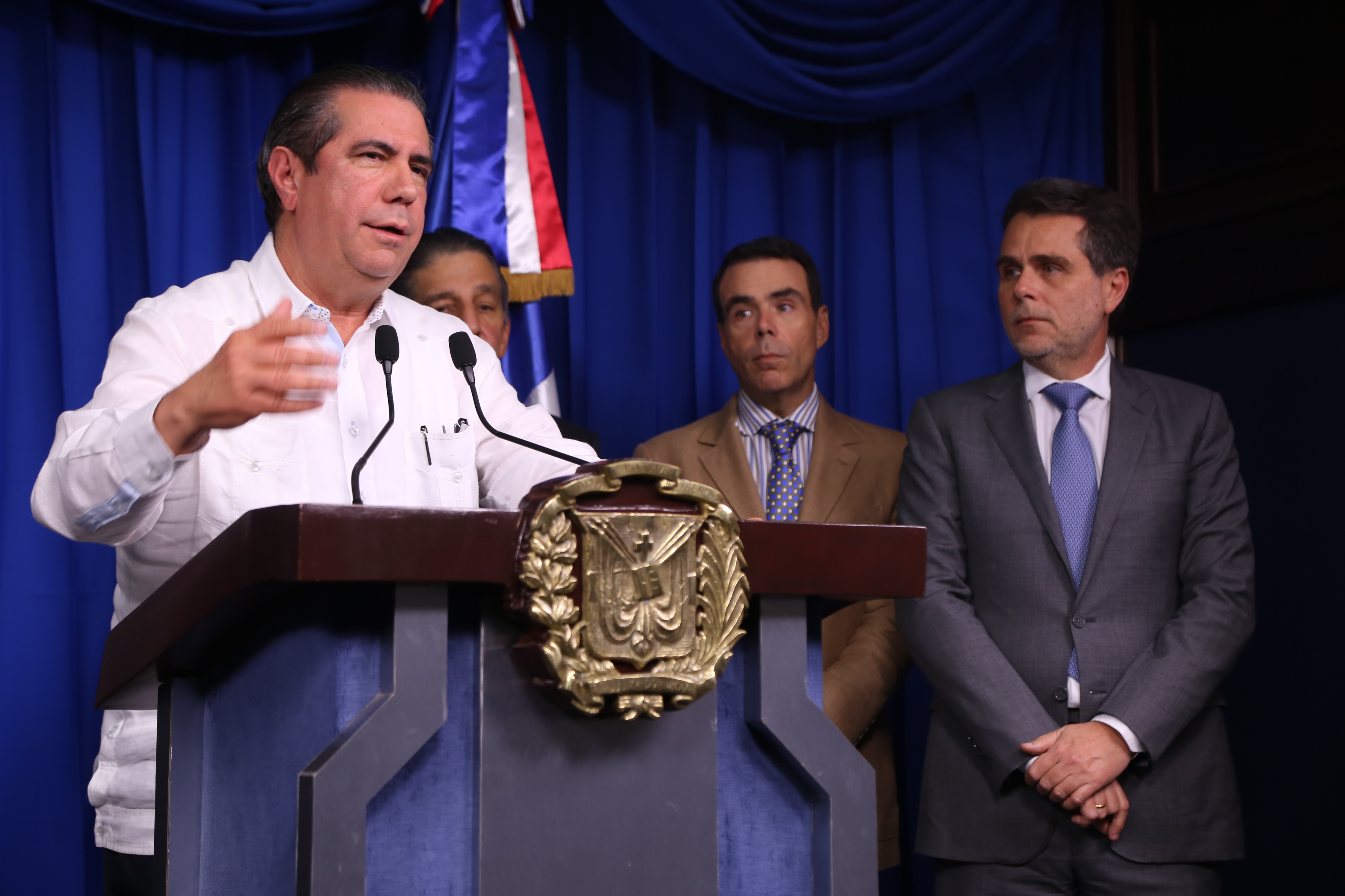 Ejecutivos del grupo empresarial Ágora, la cadena hotelera Hilton y del complejo Santiago Center, durante rueda de prensa en el Salón Orlando Martínez del Palacio Nacional.