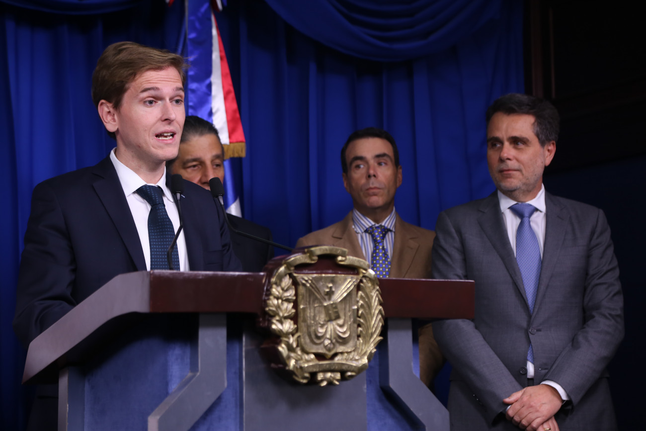 Ejecutivos del grupo empresarial Ágora, la cadena hotelera Hilton y del complejo Santiago Center, durante rueda de prensa en el Salón Orlando Martínez del Palacio Nacional.