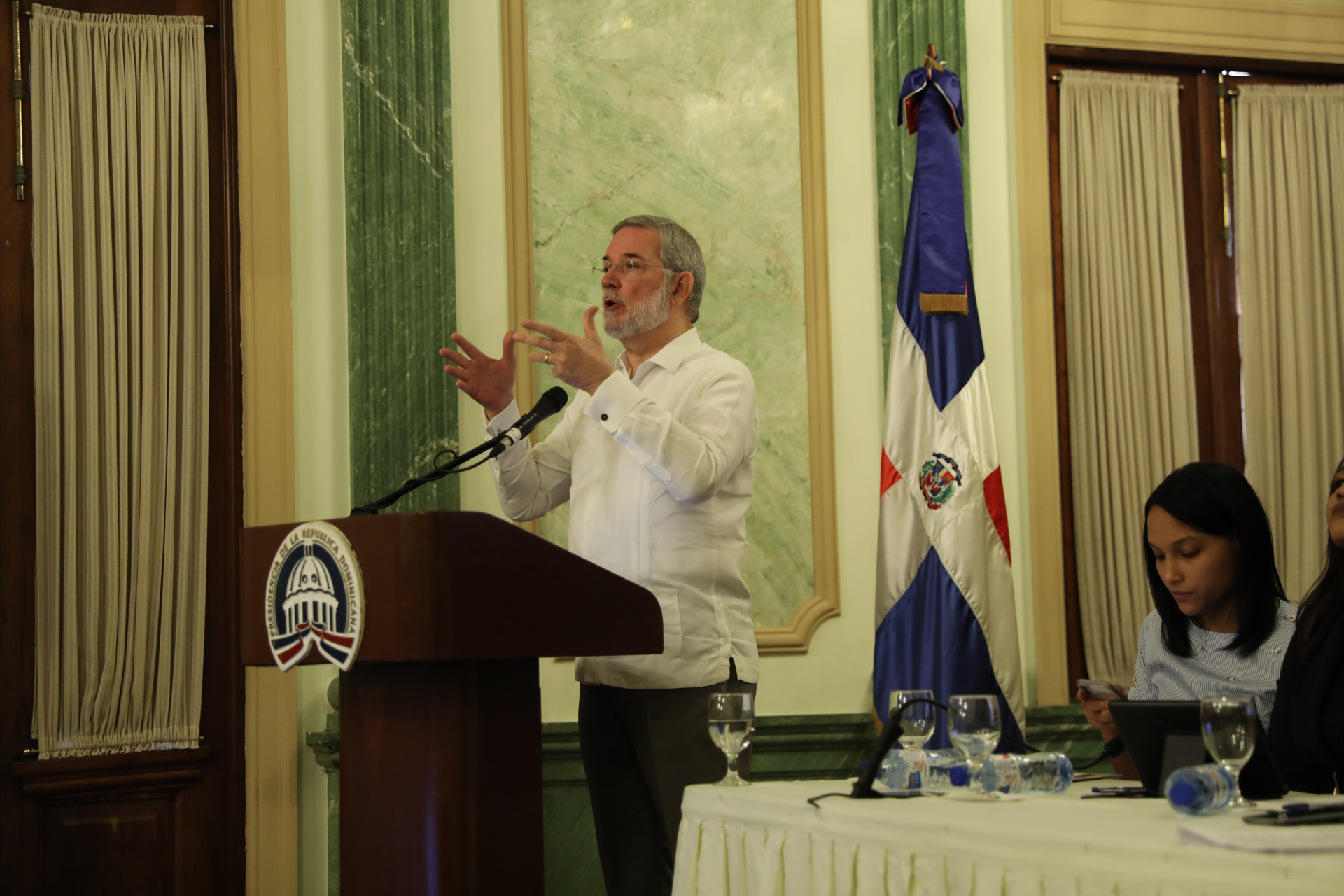 Conversatorio encabezado por el director de la DICOM y portavoz del Gobierno, Roberto Rodríguez Marchena, con la participación de microempresarios de la comunicación del Gran Santo Domingo y la provincia Bahoruco. Salón Verde del Palacio Nacional.