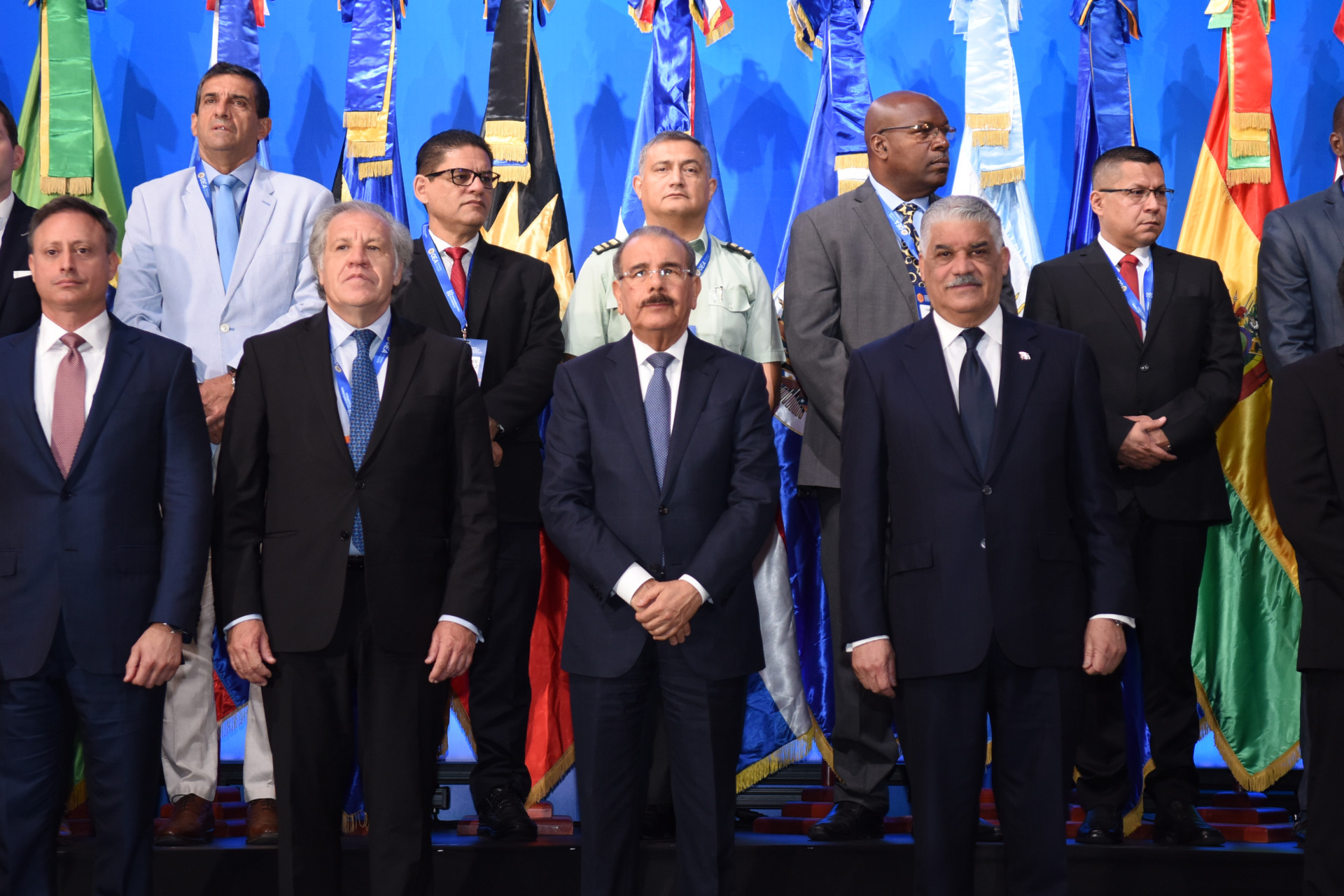 Presidente Danilo Medina, junto al ministro de Relaciones Exteriores, Miguel Vargas, el secretario general de la Organización de Estados Americanos (OEA), Luis Almagro, el procurador general de la República Dominicana, Jean Alain Rodríguez; los ministros de Justicia y de Gobernación de Guatemala, Nicaragua y Panamá, de Antigua y Barbuda; y delegaciones de directores generales penitenciarios de 28 países participantes.