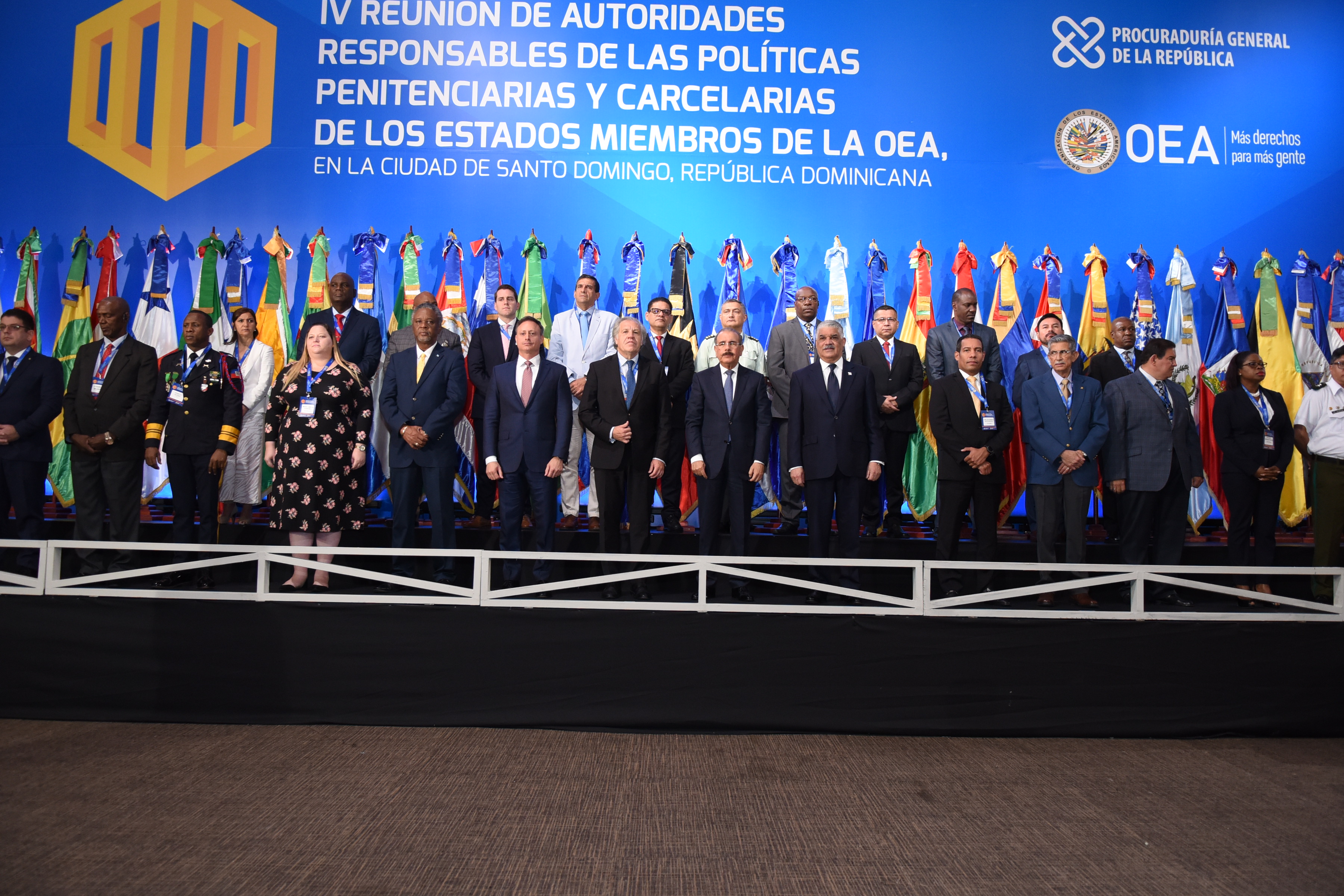 Presidente Danilo Medina, junto al ministro de Relaciones Exteriores, Miguel Vargas, el secretario general de la Organización de Estados Americanos (OEA), Luis Almagro, el procurador general de la República Dominicana, Jean Alain Rodríguez; los ministros de Justicia y de Gobernación de Guatemala, Nicaragua y Panamá, de Antigua y Barbuda; y delegaciones de directores generales penitenciarios de 28 países participantes.