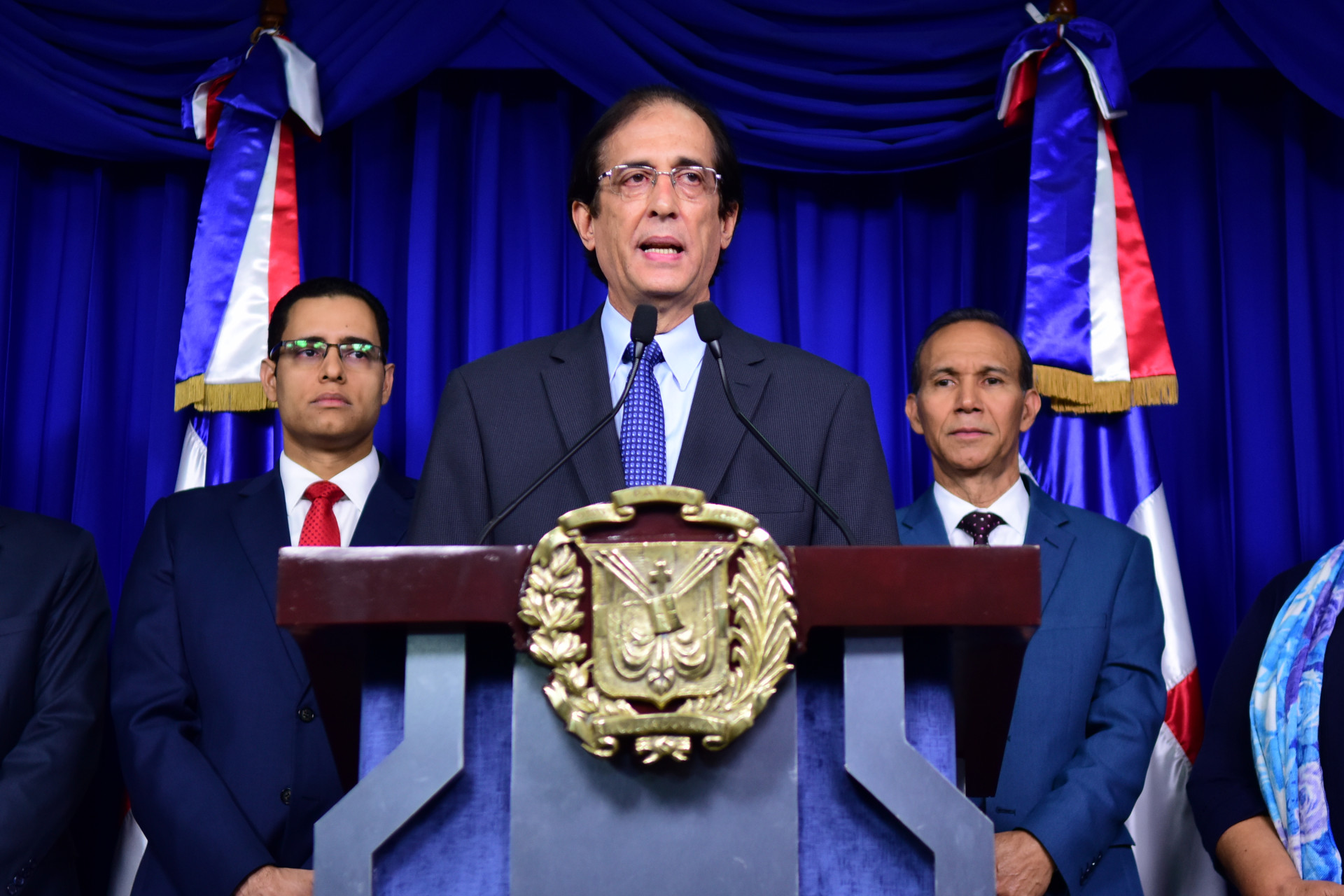 Rueda de prensa encabezada por el ministro de la Presidencia, Gustavo Montalvo, para anunciar la promulgación a reforma de Ley 13-20, de Seguridad Social. Salón Orlando Martínez del Palacio Nacional.