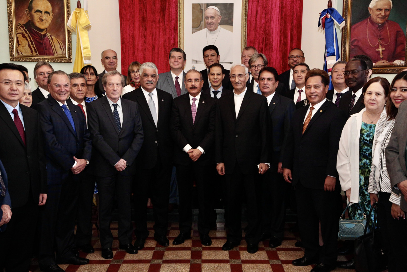Presidente Danilo Medina acompañado del ministro de Relaciones Exteriores, Miguel Vargas; el nuncio apostólico Ghaleb Moussa Abdallah Bader, embajadores, personal y colaboradores del Cuerpo Diplomático acreditado en el país.
