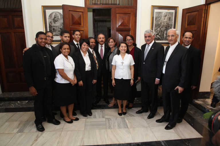 Presidente Danilo Medina acompañado del ministro de Relaciones Exteriores, Miguel Vargas; el nuncio apostólico Ghaleb Moussa Abdallah Bader, y personal de Nunciatura Apostólica de la Santa Sede.