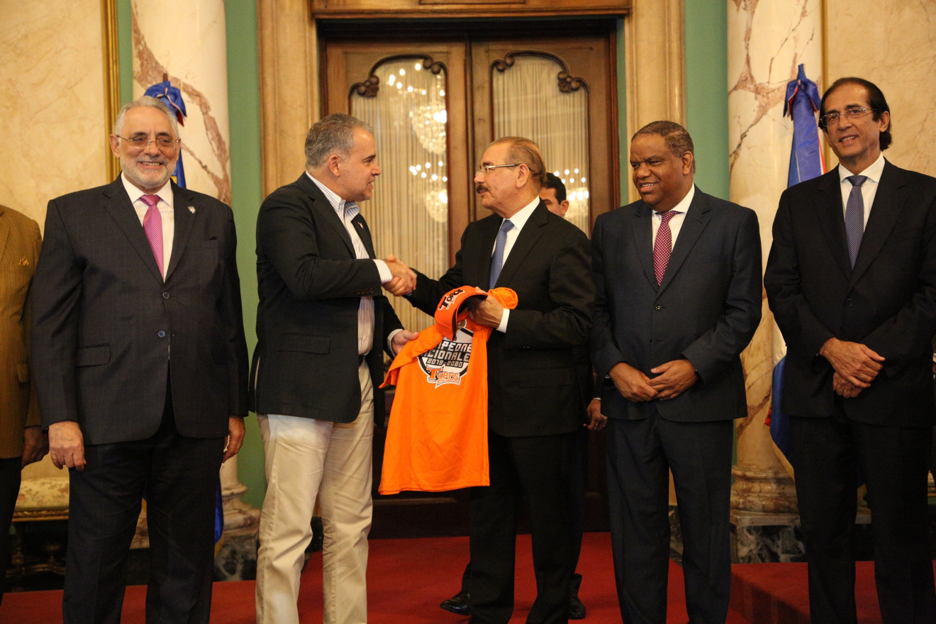 El presidente Danilo Medina recibió esta tarde con mucha alegría a los Toros del Este, campeones de la Serie del Caribe 2020, celebrada en el Estadio Hiram Bithorn en San Juan, Puerto Rico.