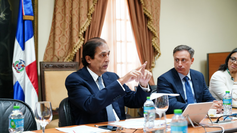 Encuentro encabezado por el ministro de la Presidencia, Gustavo Montalvo y el procurador general de la República, Jean Alain Rodríguez, con otros funcionarios presentes, en el salón Los Trinitarios del Palacio Nacional.