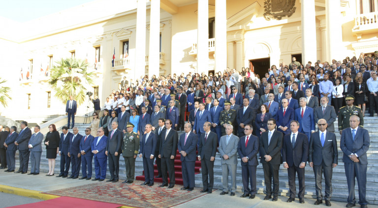 Participación del presidente Danilo Medina, acompañado de ministros, directores generales y otros empleados del Gobierno, durante acto de homenaje a la Bandera Nacional, realizado hoy en la explanada frontal del Palacio Nacional.