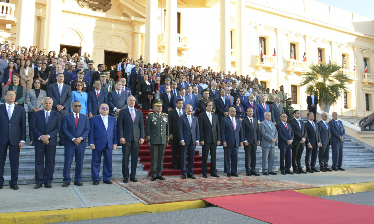 Participación del presidente Danilo Medina, acompañado de ministros, directores generales y otros empleados del Gobierno, durante acto de homenaje a la Bandera Nacional, realizado hoy en la explanada frontal del Palacio Nacional.