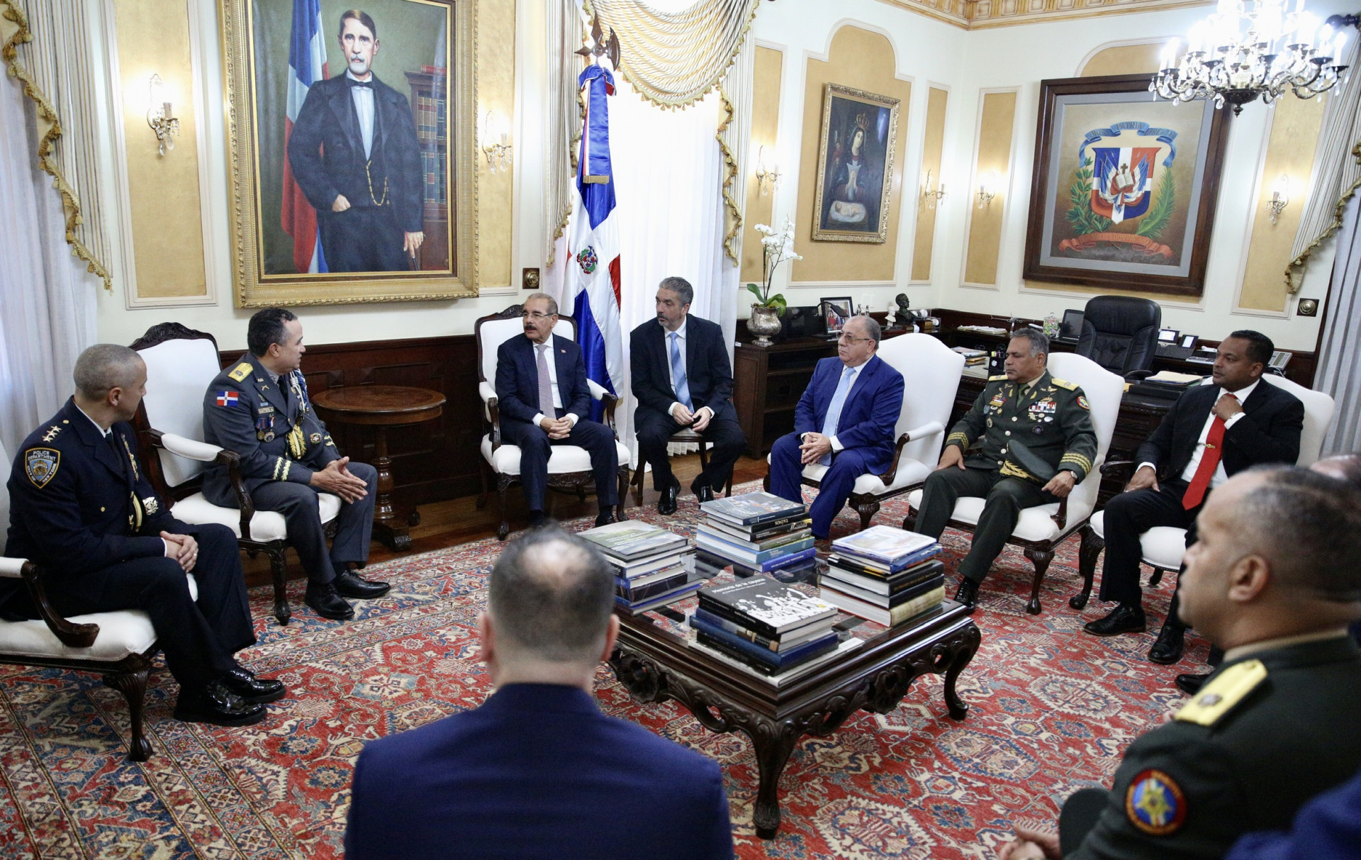 Presidente de la República, Danilo Medina Sánchez, junto a Fausto Pichardo, oficial dominicano designado jefe de patrulleros del Departamento de Policía de Nueva York (NYPD); los ministros de Defensa, teniente general Rubén Darío Paulino Sem; y de Interior y Policía, José Ramón Fadul; así como del director general de la Policía Nacional, mayor general Ney Aldrin Bautista, y otras personalidades presentes en el encuentro en el Palacio Nacional.