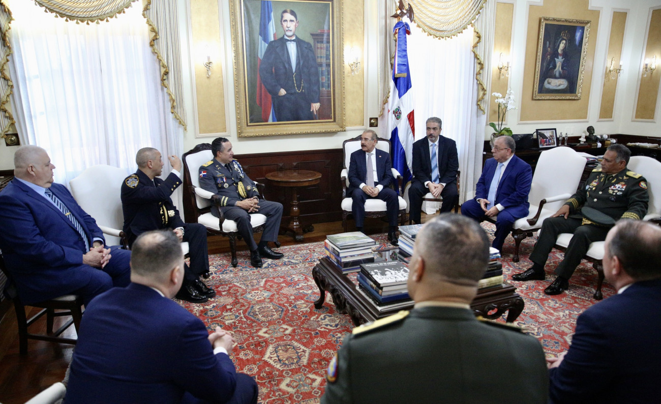 Presidente de la República, Danilo Medina Sánchez, junto a Fausto Pichardo, oficial dominicano designado jefe de patrulleros del Departamento de Policía de Nueva York (NYPD); los ministros de Defensa, teniente general Rubén Darío Paulino Sem; y de Interior y Policía, José Ramón Fadul; así como del director general de la Policía Nacional, mayor general Ney Aldrin Bautista, y otras personalidades presentes en el encuentro en el Palacio Nacional.