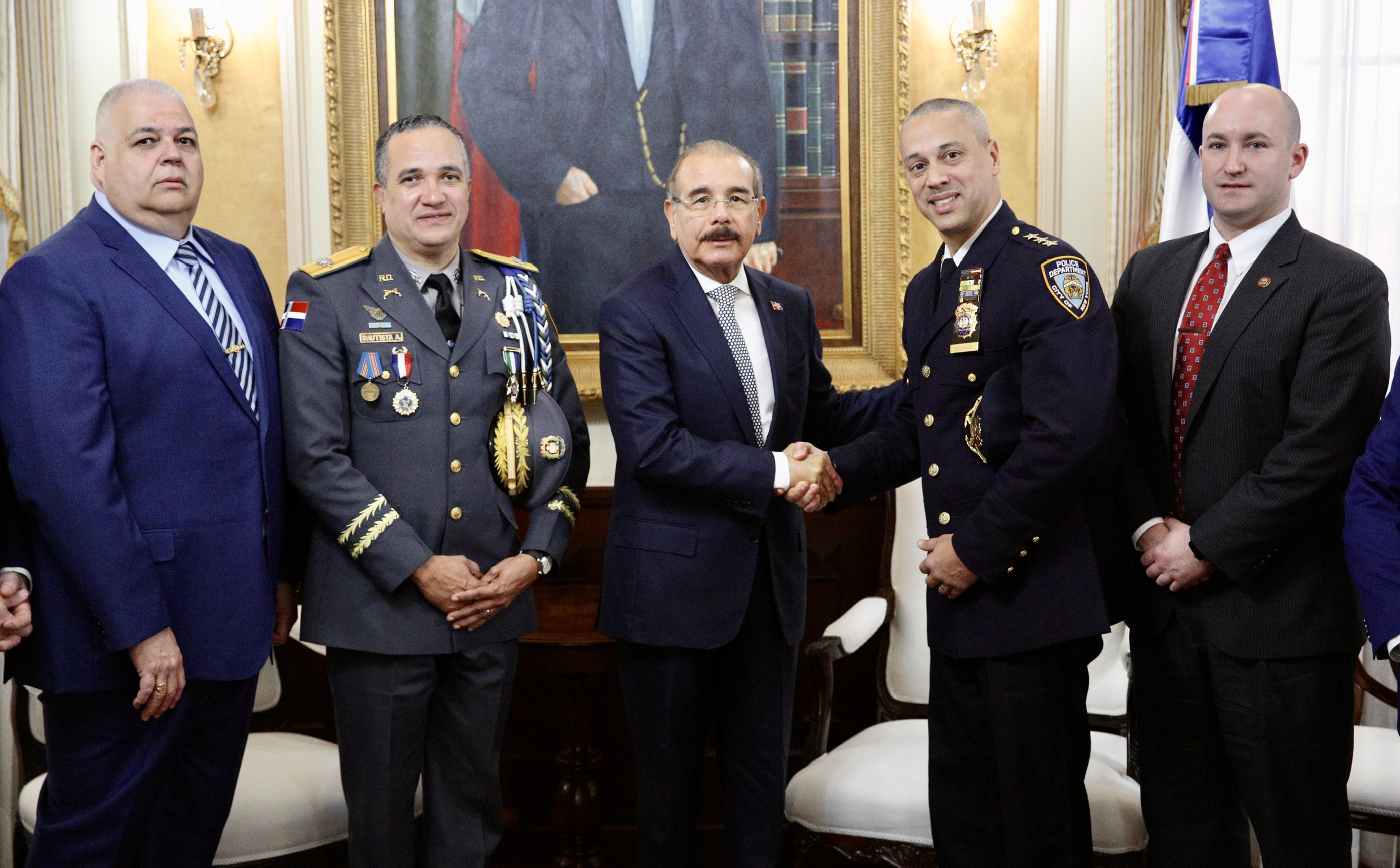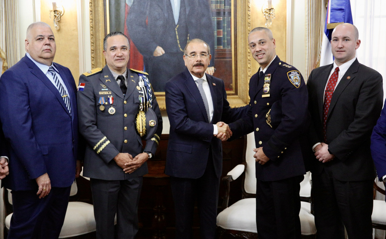 Presidente de la República, Danilo Medina Sánchez, junto a Fausto Pichardo, oficial dominicano designado jefe de patrulleros del Departamento de Policía de Nueva York (NYPD); los ministros de Defensa, teniente general Rubén Darío Paulino Sem; y de Interior y Policía, José Ramón Fadul; así como del director general de la Policía Nacional, mayor general Ney Aldrin Bautista, y otras personalidades presentes en el encuentro en el Palacio Nacional.