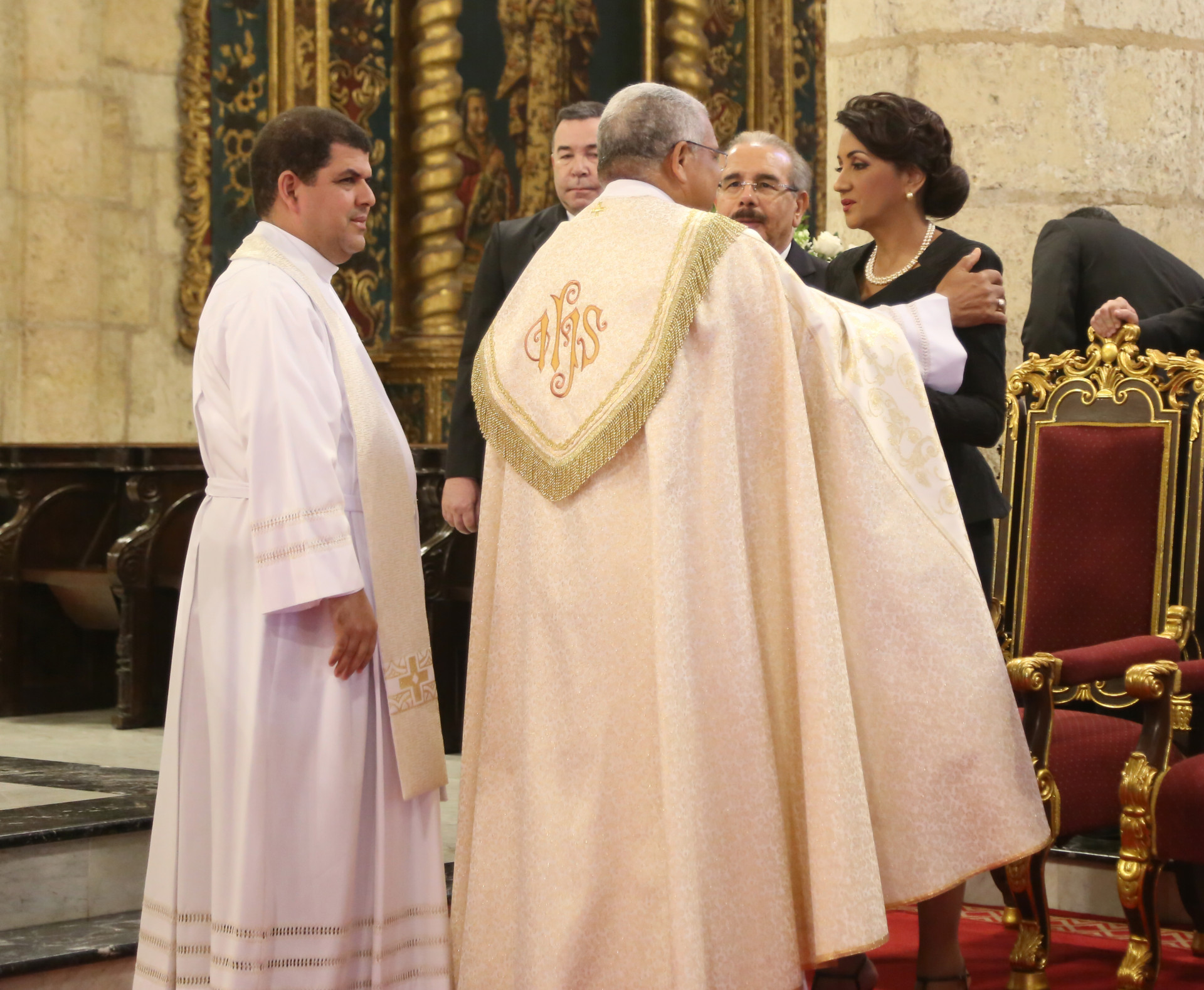 Presidente de la República, Danilo Medina, y la primera dama, Cándida Montilla de Medina, mientras saludan a monseñor Francisco Ozoria.