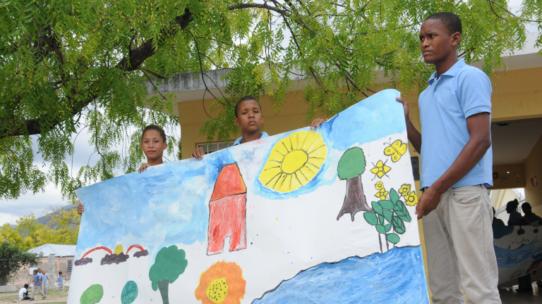 Muestra de un mural dibujado por varios estudiantes de la comunidad del Nuevo Boca de Cachón, presentes en las actividades programadas en víspera del acto de inauguración.