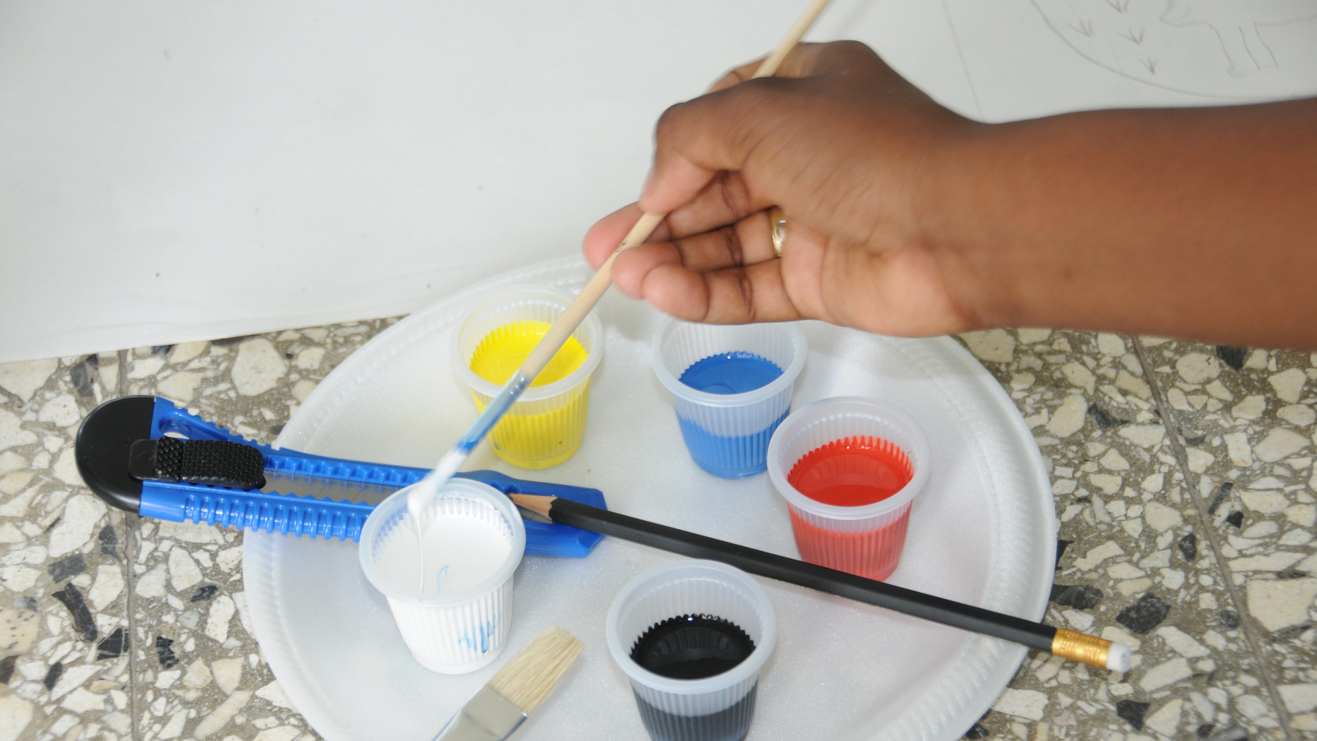 Materiales y pinturas de diferentes colores utilizados para las actividades infantiles de recreación, en víspera del acto inaugural encabezado por el Señor Presidente.