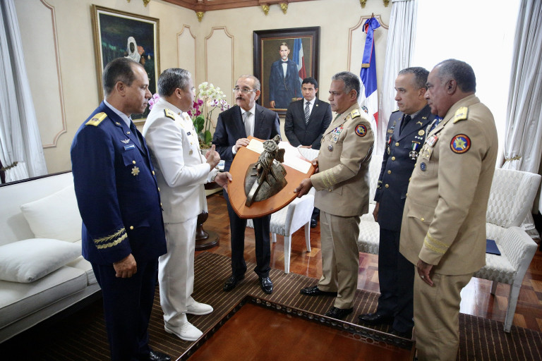 El presidente de la República, Danilo Medina, acompañado de la comisión de los altos mandos militares, en su despacho del Palacio Nacional.