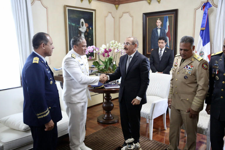 El presidente de la República, Danilo Medina, acompañado de la comisión de los altos mandos militares, en su despacho del Palacio Nacional.