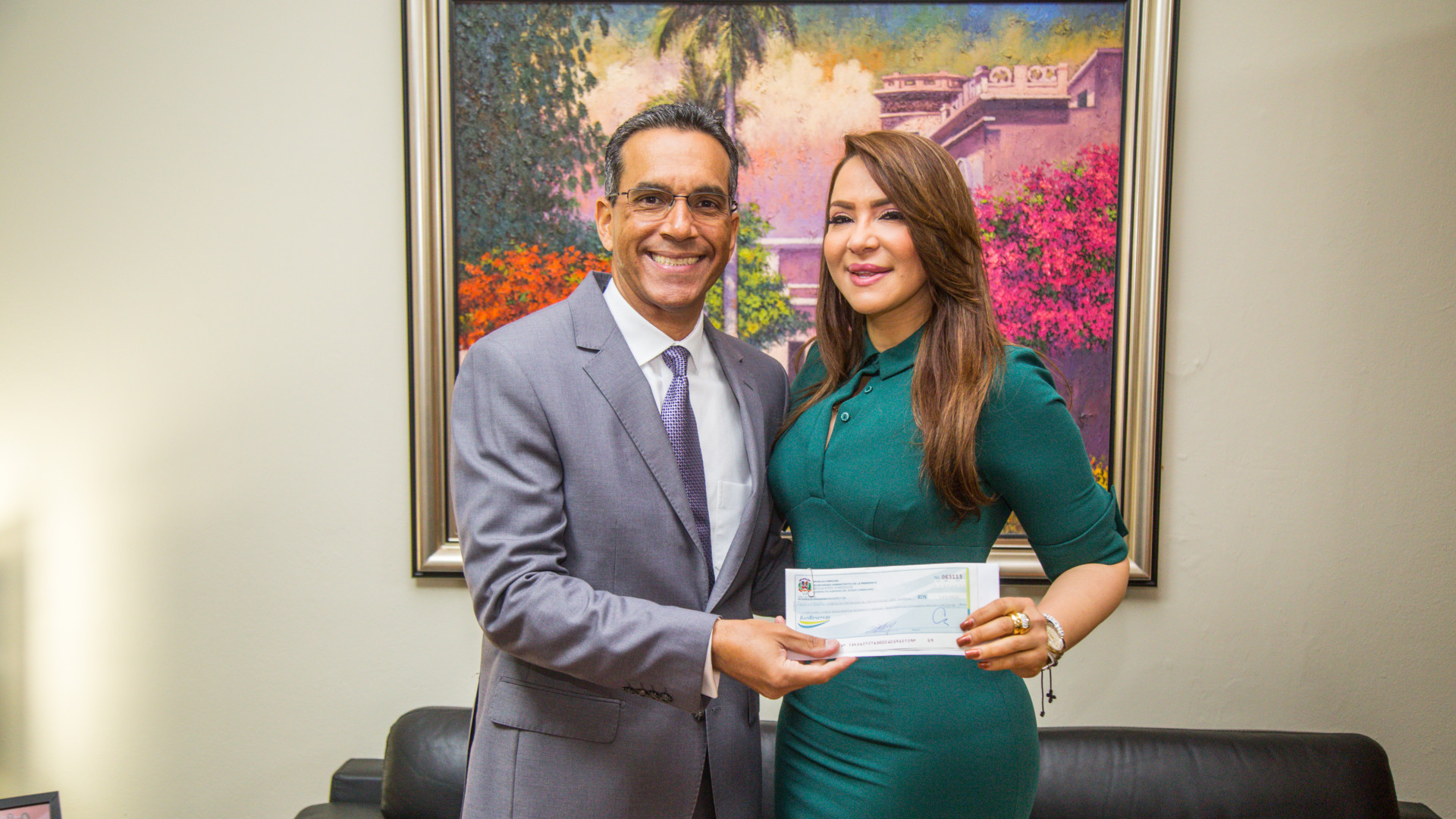 Viceministro Juan Pumarol durante la entrega de los fondos a la presidenta de la Comisión Presidencial de Apoyo al Desarrollo Barrial, Lethi Vázquez, para el remozamiento de la cancha deportiva del sector de Sabana Perdida, en Santo Domingo Norte.