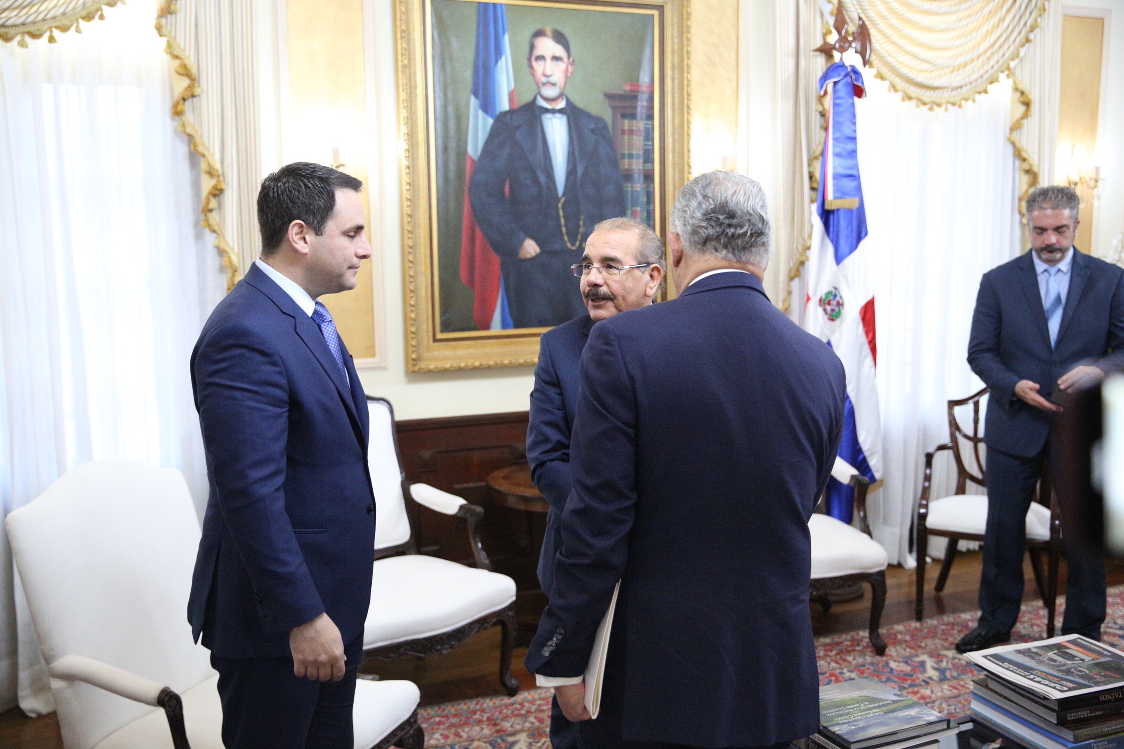 Presidente Danilo Medina durante visita del embajador estadounidense ante la Organización de los Estados Americanos (OEA), Carlos Trujillo, junto al canciller Miguel Vargas, en su despacho del Palacio Nacional.