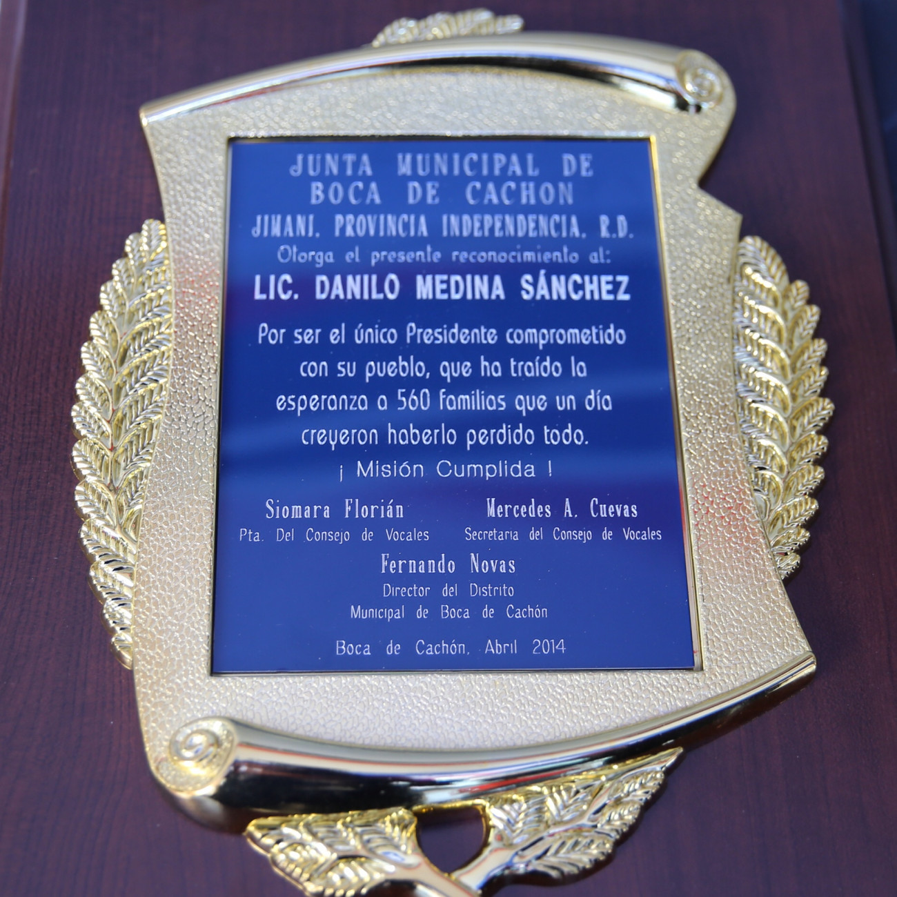 Placa de reconocimiento entregada al Presidente de la República, Danilo Medina Sánchez por la Junta Municipal de Boca de Cachón en agradecimiento por la realización de la obra.