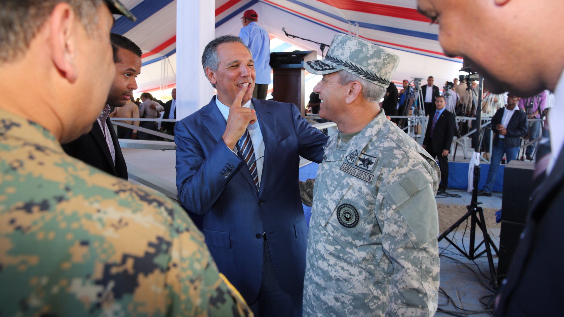 Ministro José Ramón Peralta y Sigfrido Aramis Pared Pérez, almirante de la Armada de la República Dominicana, mientras conversan animadamente, previo al acto inaugural de la obra encabezada por el presidente Danilo Medina.