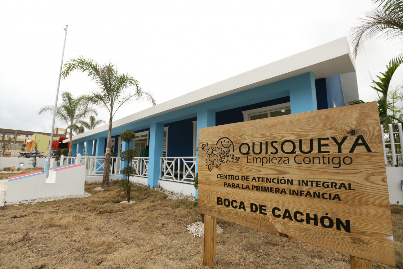 Vista frontal del Centro de atención integral para la primera infancia del proyecto habitacional Nuevo Boca de Cachón, como parte de los programas prometidos y ejecutados por el presidente Danilo Medina Sánchez.