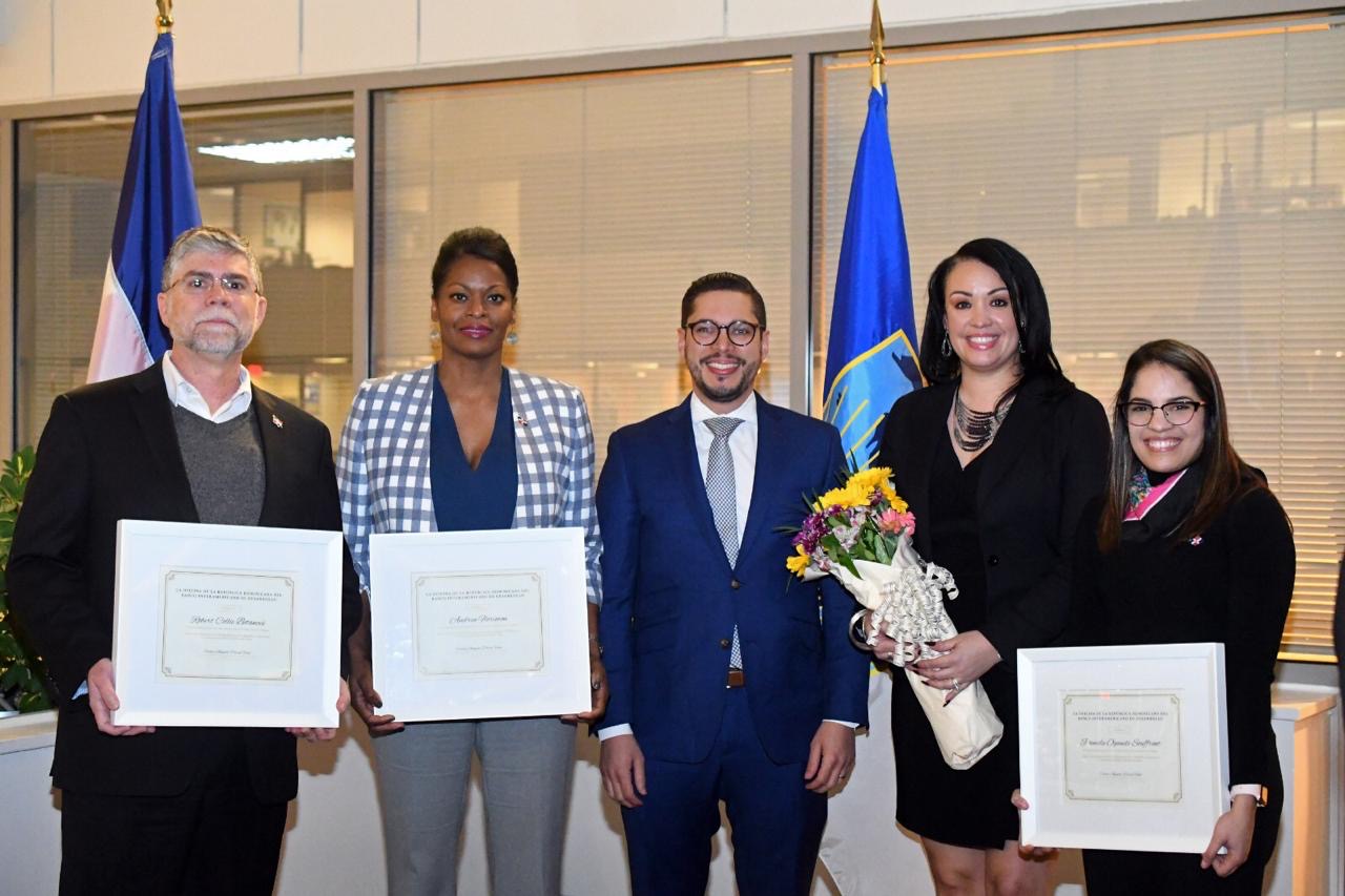 Carlos Pared Vidal junto a Robert Collie, Andrea Florimón, Pamela Ogando Souffront, y Damaris Brown, quienes fueron reconocidos durante el evento por su desempeño en la institución.