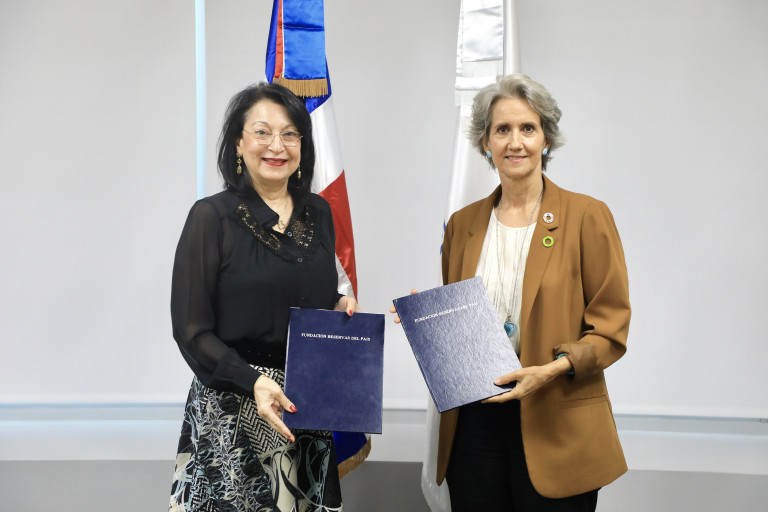 Rosa Rita Álvarez, presidenta ejecutiva de Reservas del País, y Ginny Heinsen Bogaert, directora ejecutiva de Sostenibilidad 3Rs, al firmar esta mañana el acuerdo para propiciar una gestión ambiental sostenible en las entidades de microfinanzas solidarias.