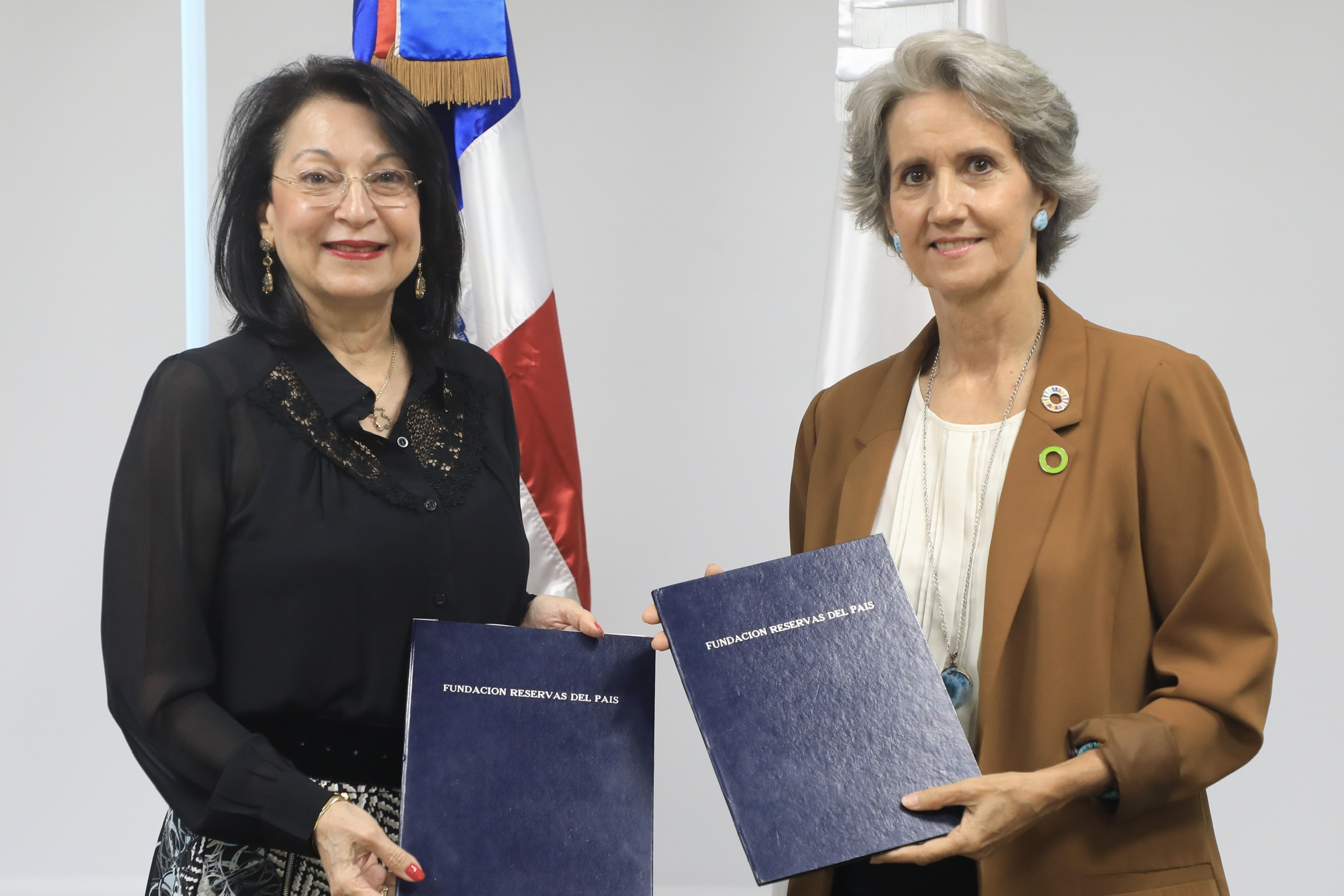 Rosa Rita Álvarez, presidenta ejecutiva de Reservas del País, junto a Ginny Heinsen Bogaert, directora ejecutiva de Sostenibilidad 3Rs, firmaron esta mañana un acuerdo para propiciar una gestión ambiental sostenible en las entidades de microfinanzas solidarias.