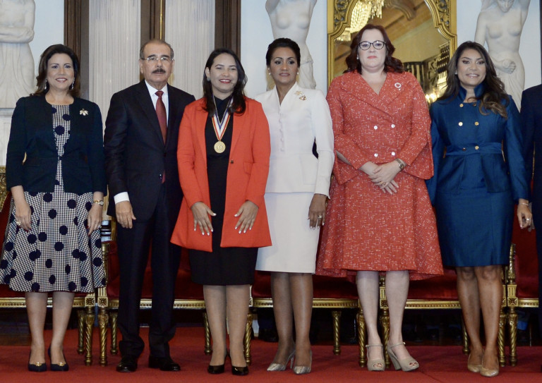Vicepresidenta Margarita Cedeño, presidente Danilo, Agripina Ramírez, reconocida en el renglón Profesional de Ciencias; la primera dama Cándida Montilla de Medina, la ministra de la Mujer, Janet Camilo, y la ministra de la Juventud, Robiamny Balcácer.