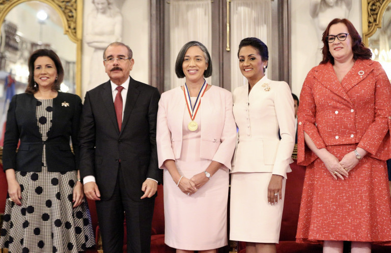 Vicepresidenta Margarita Cedeño, presidente Danilo, Lourdes Ventura, profesional destacada de la diáspora; la primera dama Cándida Montilla de Medina, y la ministra de la Mujer, Janet Camilo.