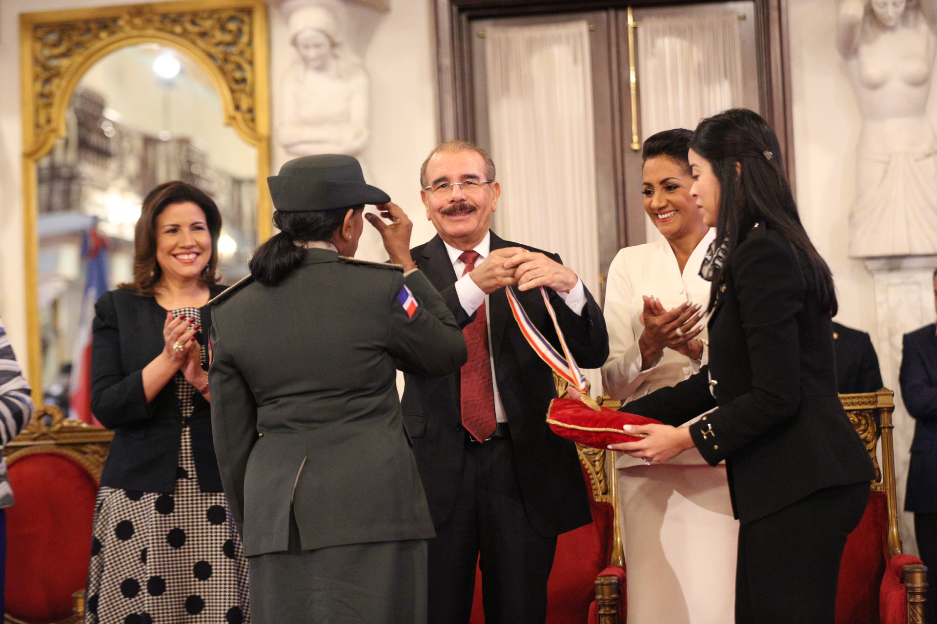 Presidente Danilo al imponer la medalla de reconocimiento a la coronela Ana Matos Féliz, galardonada como Profesional Militar.