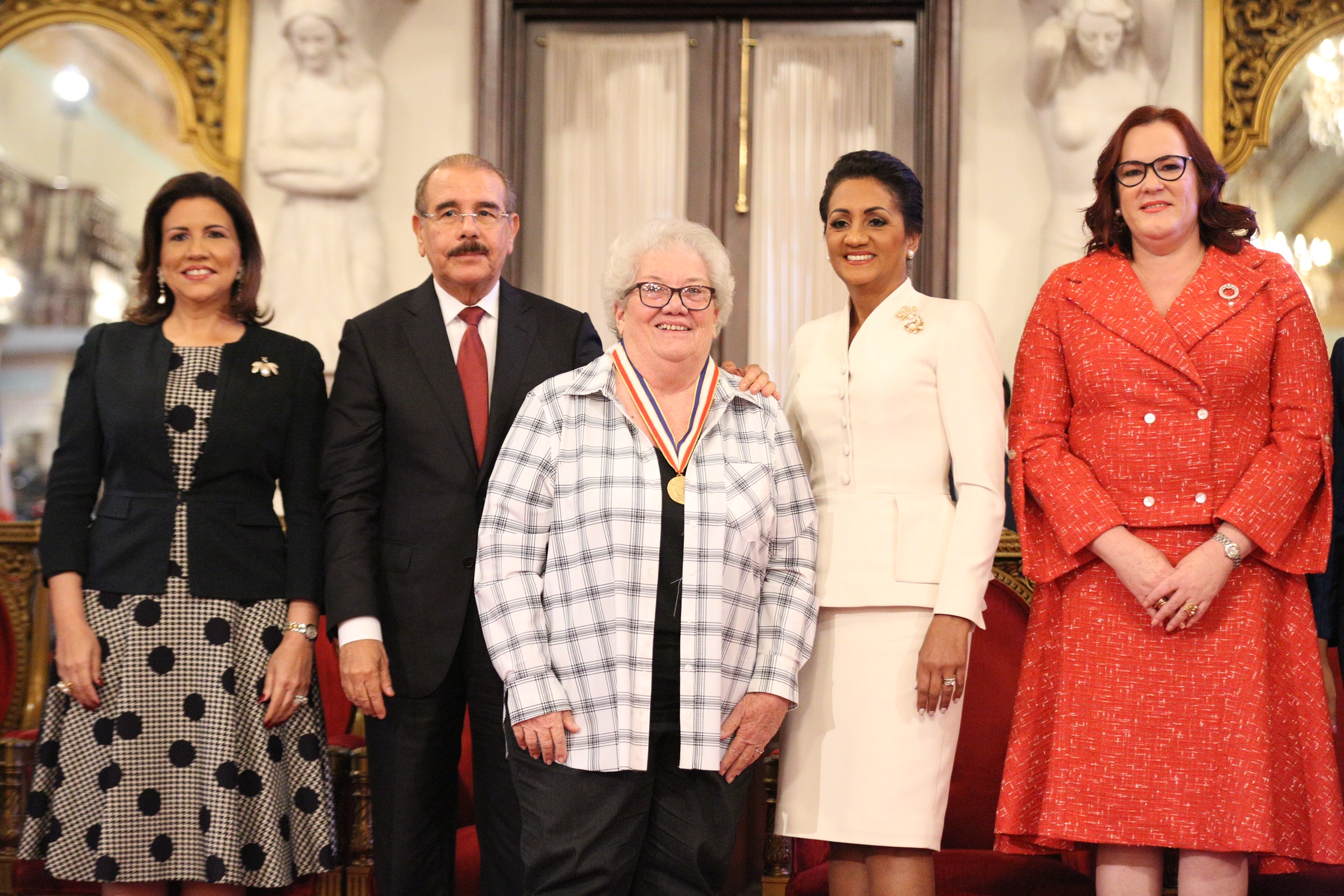 Vicepresidenta Margarita Cedeño, presidente Danilo Medina junto a la dramaturga Germana Quintana reconocida en Artes; la primera dama Cándida Montilla de Medina, la ministra de la Mujer, Janet Camilo, y la ministra de la Juventud, Robiamny Balcácer.