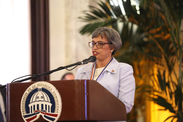 María Altagracia Tejeda galardonada con Medalla al Mérito de la Mujer Dominicana en Mujer Rural, durante su discurso de agradecimiento en nombre de las homenajeadas.