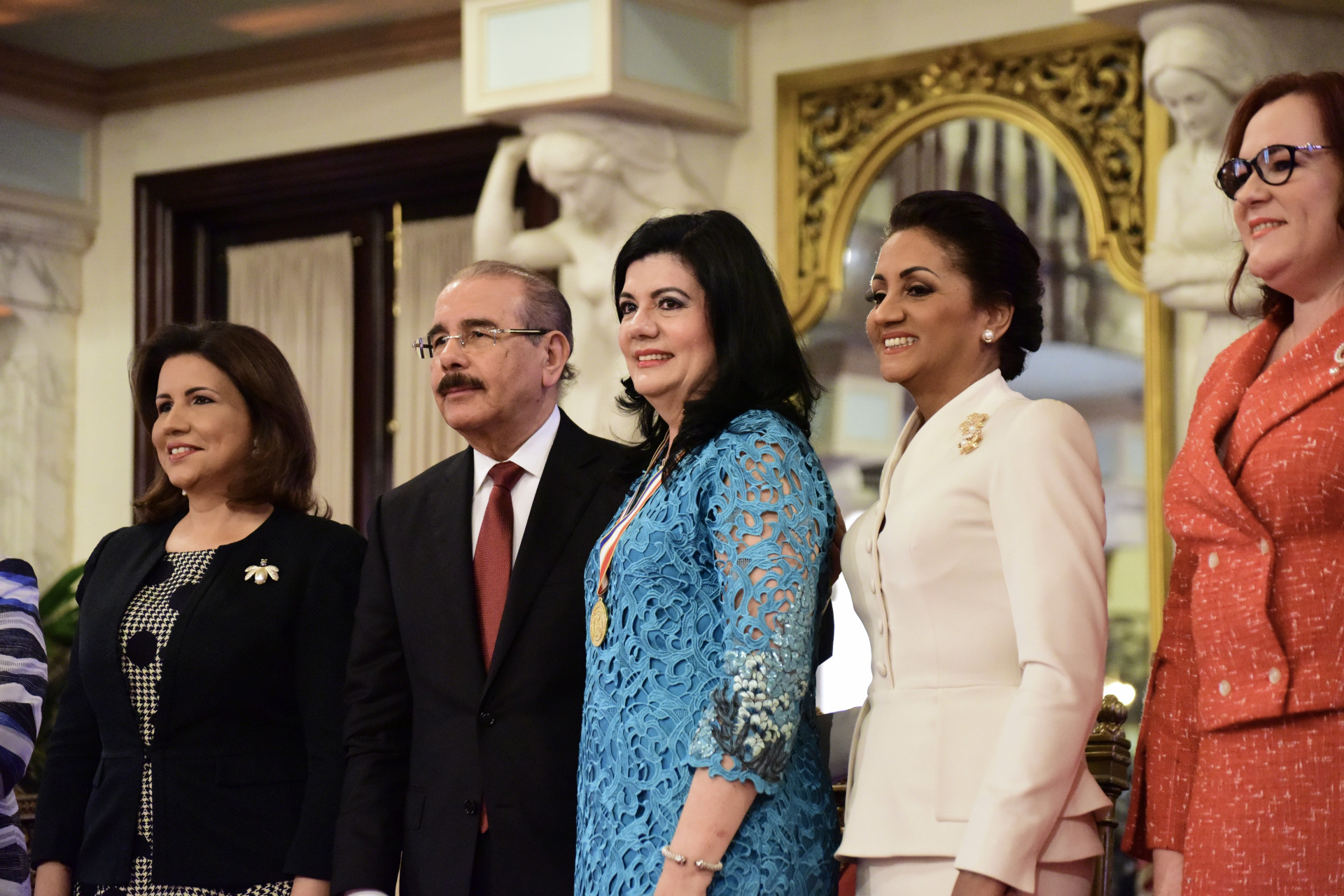Vicepresidenta Margarita Cedeño, presidente Danilo, Rosa María (Mery) Kasse Soto, galardonada en Participación Política; la primera dama Cándida Montilla de Medina, y la ministra de la Mujer, Janet Camilo.