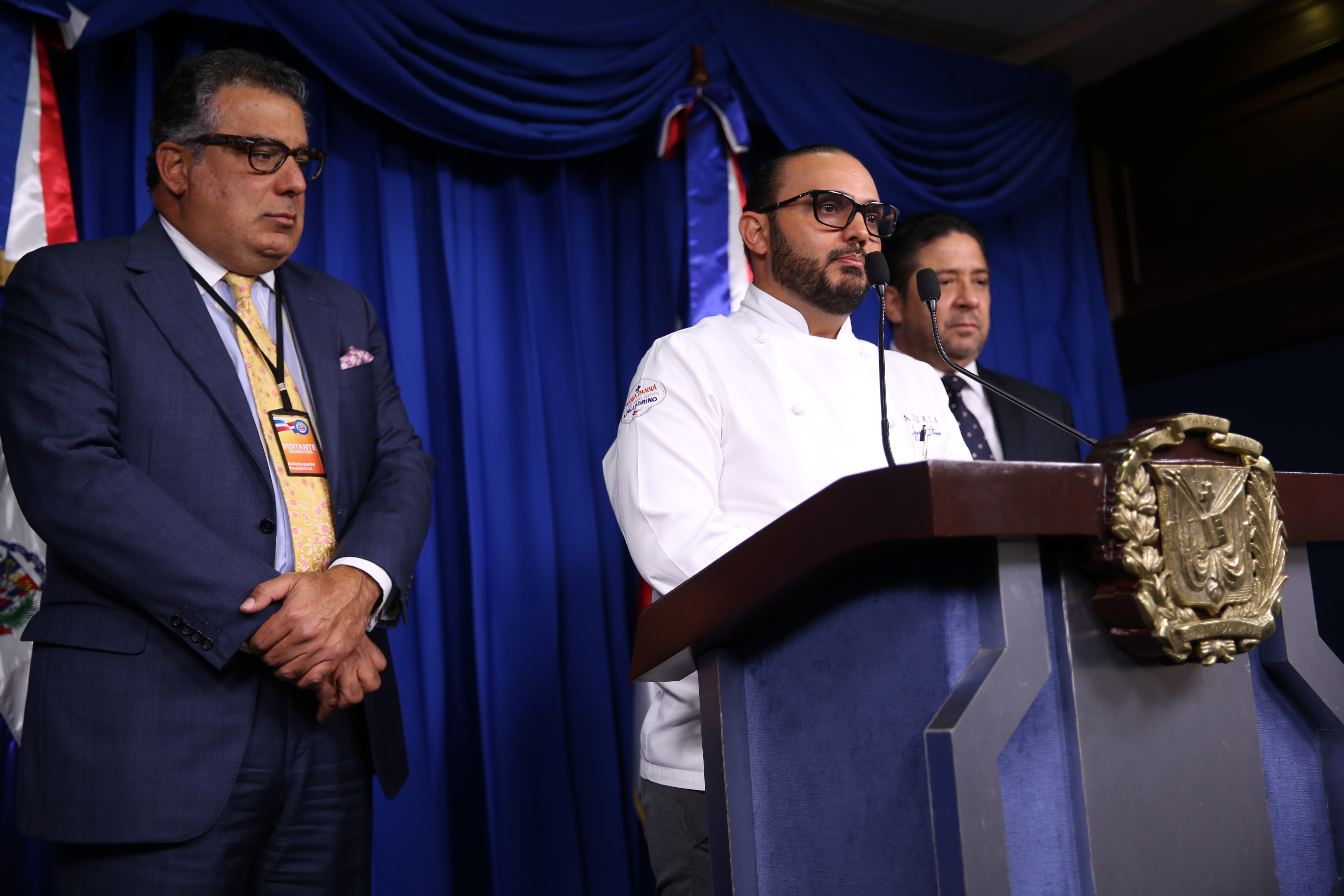Rafael Cabrera, presidente de la ADERES; Enrique de Marchena, de la Academia Dominicana de Gastronomía; y el propietario del restaurante Ajualä, Saverio Stassi, durante rueda de prensa tras ser recibidos por el jefe de Estado. Salón Orlando Martínez del Palacio Nacional.