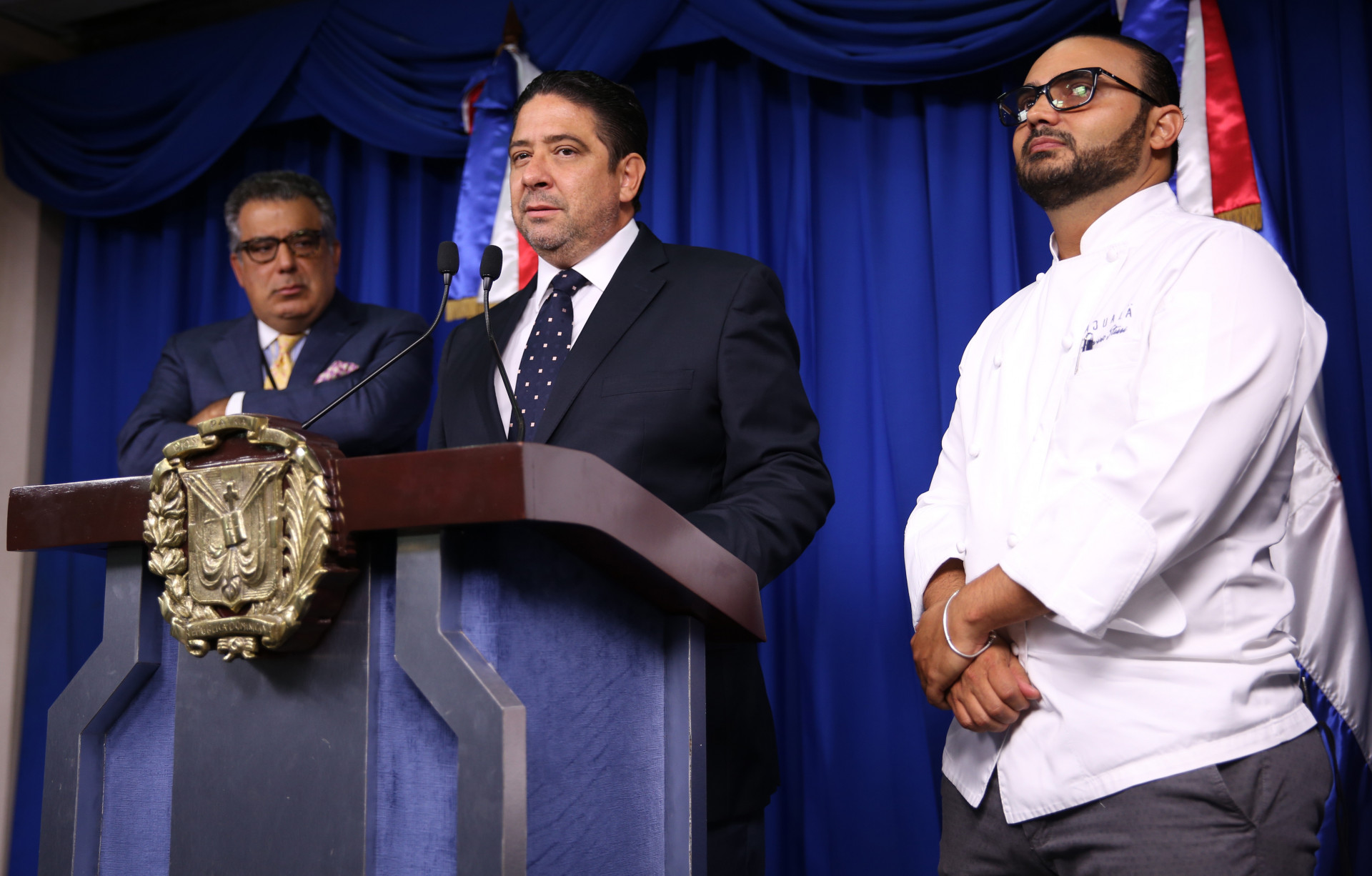 Rafael Cabrera, presidente de la ADERES; Enrique de Marchena, de la Academia Dominicana de Gastronomía; y el propietario del restaurante Ajualä, Saverio Stassi, durante rueda de prensa tras ser recibidos por el jefe de Estado. Salón Orlando Martínez del Palacio Nacional.