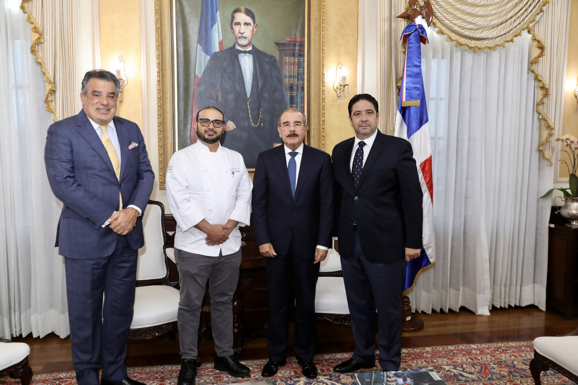 El presidente Danilo Medina, Rafael Cabrera, presidente de la ADERES; Enrique de Marchena, de la Academia Dominicana de Gastronomía; y el propietario del restaurante Ajualä, Saverio Stassi, durante encuentro en el Salón Privado del Palacio Nacional.