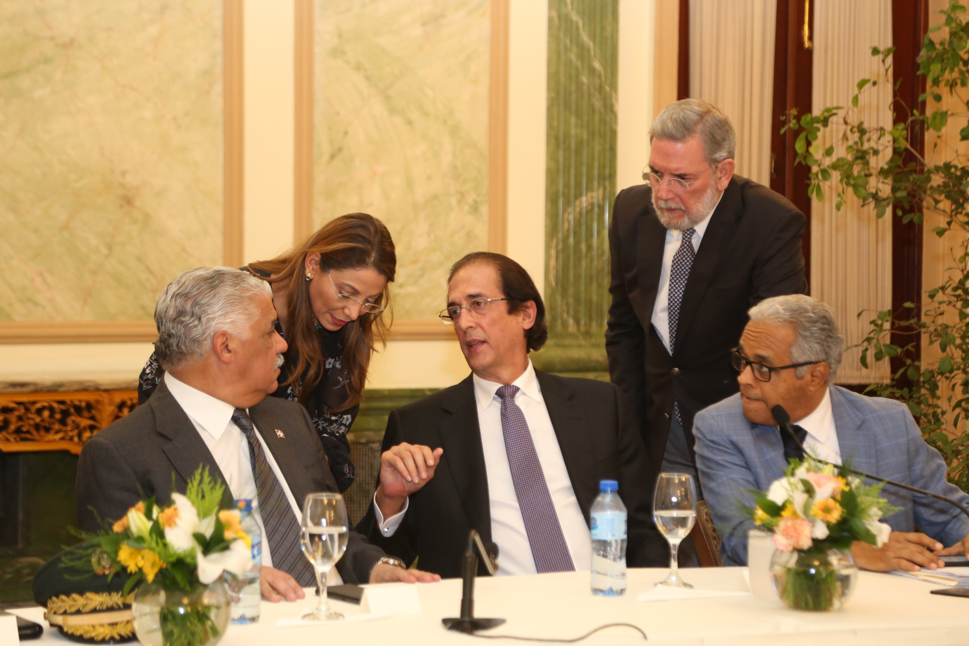 Ministro de Relaciones Exteriores, Miguel Vargas Maldonado, la representante de la OPS/OMS en el país, Alma Morales; el ministro de la Presidencia, Gustavo Montalvo, el portavoz de la Presidencia, Roberto Rodríguez Marchena, y el ministro de Salud Pública, Rafael Sánchez Cárdenas, durante el encuentro.