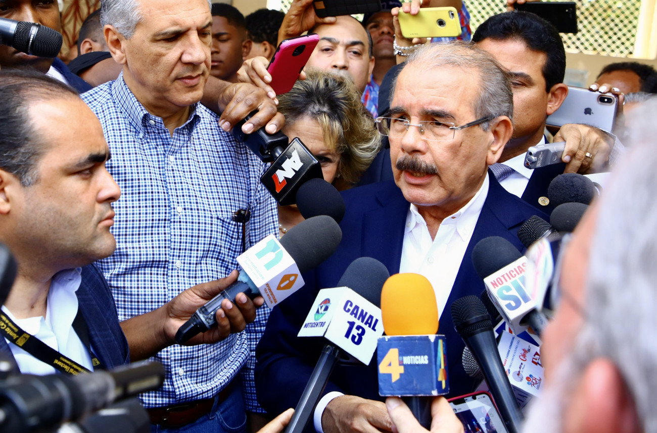 El presidente Danilo Medina mientras responde a periodista luego de ejercer su derecho al voto, en la Casa Provincial Hijas de María Auxiliadora del sector Don Bosco, del Distrito Nacional.