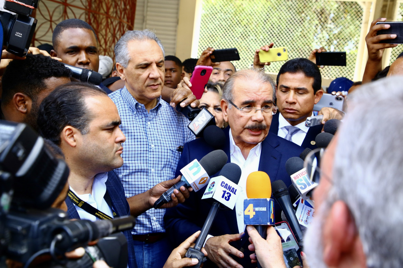 El presidente Danilo Medina mientras responde a periodista luego de ejercer su derecho al voto, en la Casa Provincial Hijas de María Auxiliadora del sector Don Bosco, del Distrito Nacional.