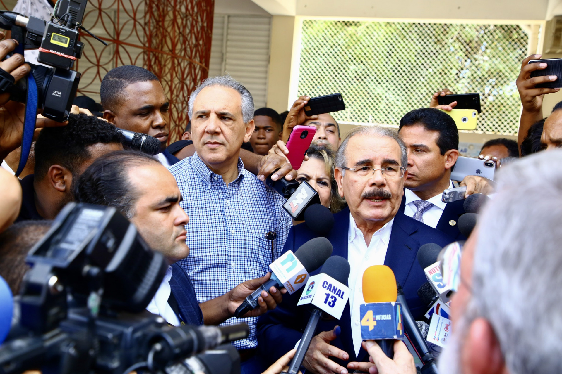 El presidente Danilo Medina mientras responde a periodista luego de ejercer su derecho al voto, en la Casa Provincial Hijas de María Auxiliadora del sector Don Bosco, del Distrito Nacional.